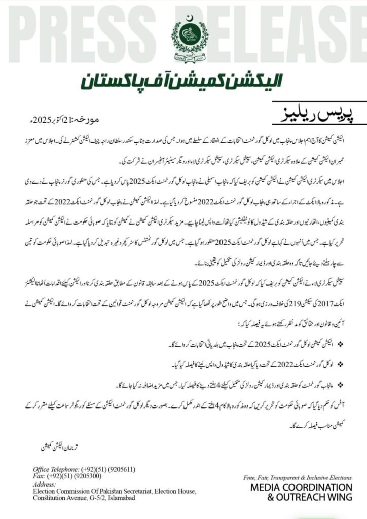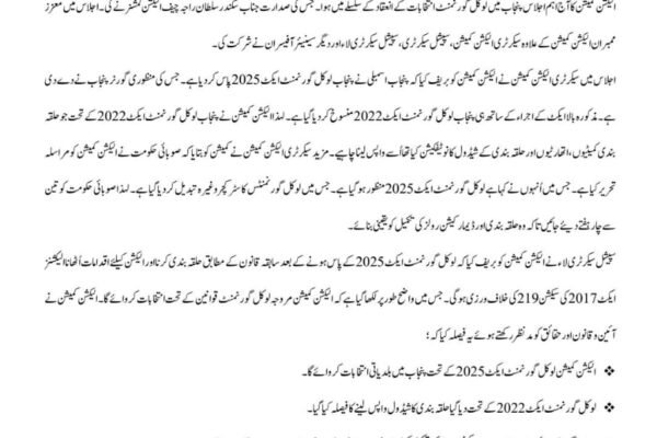 فیصلہ چیف الیکشن کمشنر کی زیر صدارت اجلاس میں پنجاب حکومت کی درخواست پر کیا گیا…!!!پنجاب اسمبلی نے لوکل گورنمنٹ ایکٹ 2025 پاس کرلیا،سیکرٹری الیکشن کمیشن کی بریفنگ …!!!گورنر پنجاب نے بھی ایکٹ کی منظوری دے دی ہے، سیکرٹری الیکشن کمیشن کی بریفنگ…!!!ایکٹ 2025 کے اجراء کے ساتھ ہی 2022 والا ایکٹ منسوخ ہوگیا،سیکرٹری الیکشن…