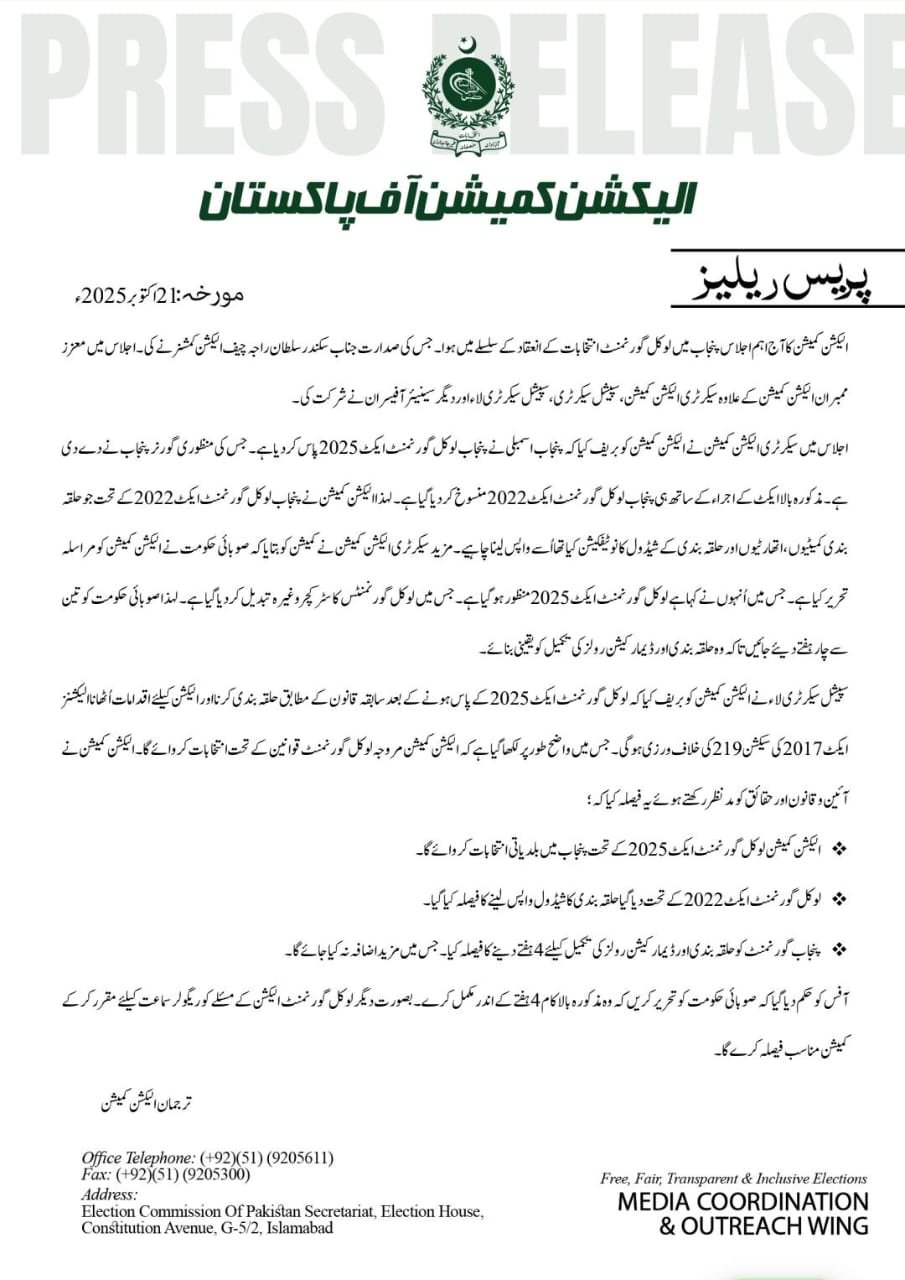 فیصلہ چیف الیکشن کمشنر کی زیر صدارت اجلاس میں پنجاب حکومت کی درخواست پر کیا گیا…!!!